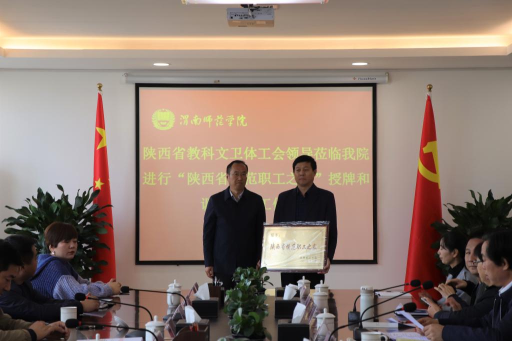 会上,陈鹏宣读了陕西省总工会表彰文件,陈建树代表陕西省总工会向渭南师范学院颁发了“陕西省模范职工之家”牌匾。