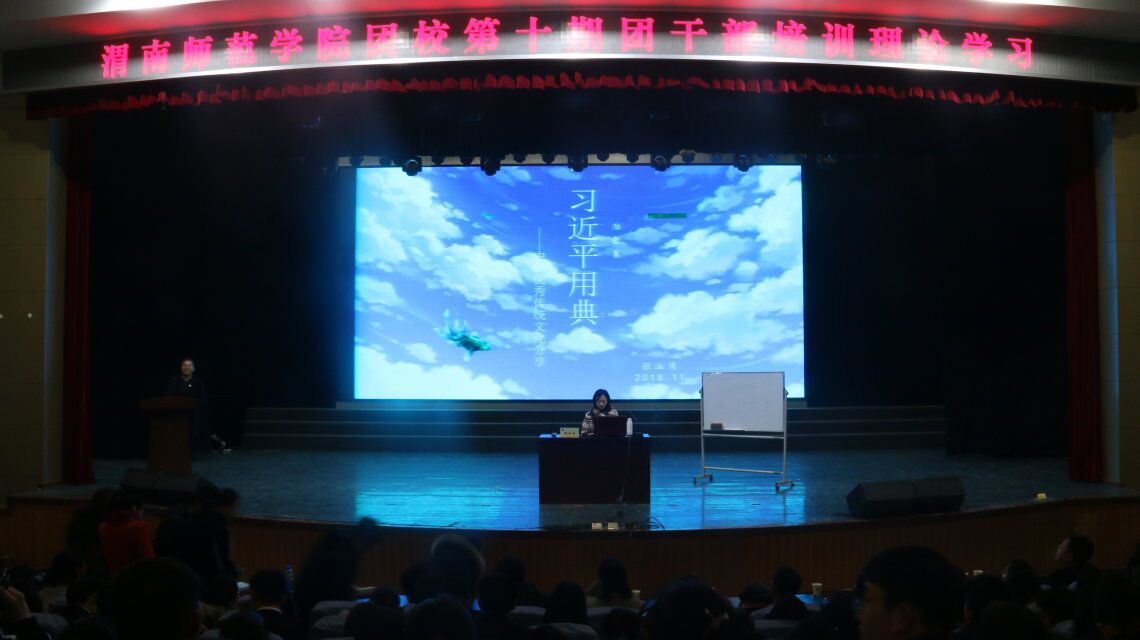 启动仪式后,渭南市政府副秘书长张淑隽为同学们作了题为《习近平用典—中国优秀传统文化分享》的报告,她从自强、厚德、立志等方面引导学生研读优秀传统文化典籍,固本培元,以不断提高人生素养与精神境界。校团委办公室主任刘娟宁作了题为《校园文化活动的组织与开展》的讲座,从校园文化的内涵、特点、教育功能、活动开展四个方面详细讲解了校园文化活动对改善校园文化氛围、促进校园文化发展繁荣的重要意义。校团委郭倩作了题为《基层团支部职能与团干部成长》的讲座,从走进共青团、在组织中成长、我是一名共青团干部、团组织的基石-团支部、团的活动五个方面讲解了基层团支部职能与团干部基本功、能力要求。校团委郭艺歌作了《共青团“第二课堂”成绩单网络管理系统“到梦空间”学生端使用手册》操作办法的讲座,细致讲解了部落管理、活动发布、活动管理等。培训中,校团委副书记姚明亮作了题为《习近平总书记关于青年工作的重要思想》的讲座,结合习近平总书记7.2讲话精神和团的十八大会议精神对习近平总书记关于青年工作的重要思想进行阐释,并就我校共青团工作实际、楼宇建团工作实际和团干部职责、素质与能力对团干部提出新的更高要求。(通讯员 郭倩)