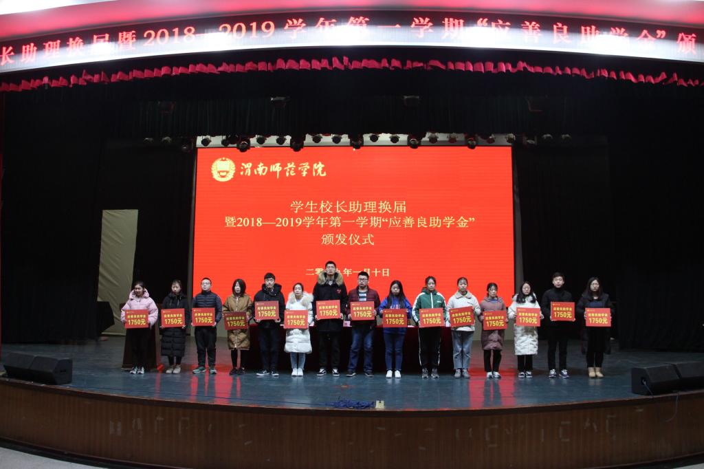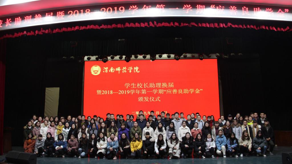 王俊安宣读了我校2018-2019学年应善良受助学生名单。随后,与会领导及嘉宾向受助学生颁发了助学金并合影留念。