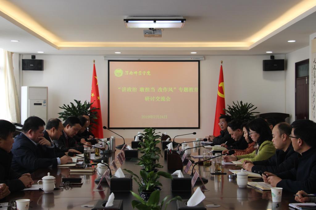 为认真落实省委教育工委《关于在全省高校处级以上领导人员中开展“讲政治、敢担当、改作风”专题教育实施方案》要求,进一步推动我校专题教育深入开展,2月24日下午,学校召开“讲政治、敢担当、改作风”专题教育研讨交流会。党委书记卓宇主持会议并讲话。学校“讲政治、敢担当、改作风”专题教育领导小组全体成员参加会议。