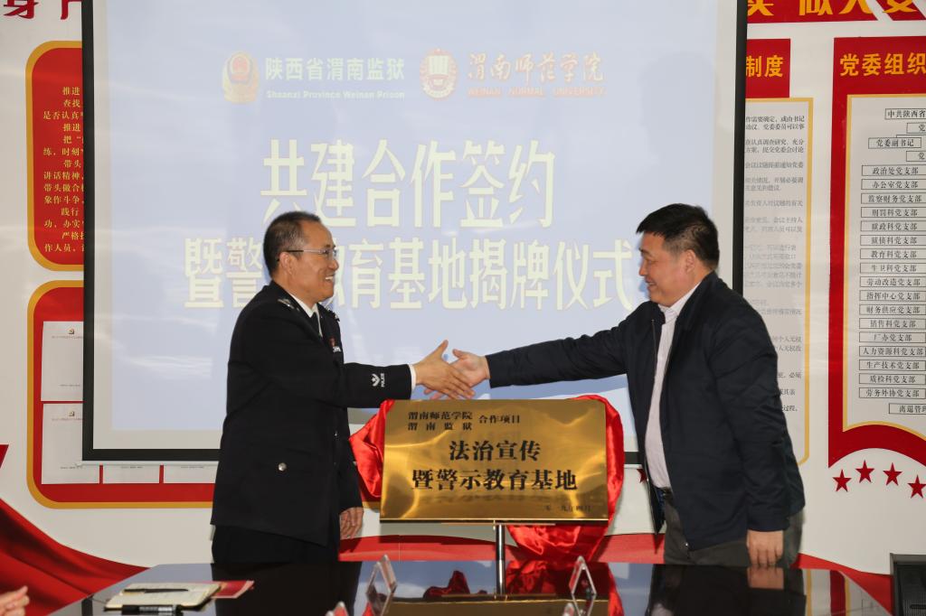 渭南师范学院党委书记卓宇与渭南监狱党委书记、监狱长刘玉武为“法治教育暨警示教育基地”揭牌。