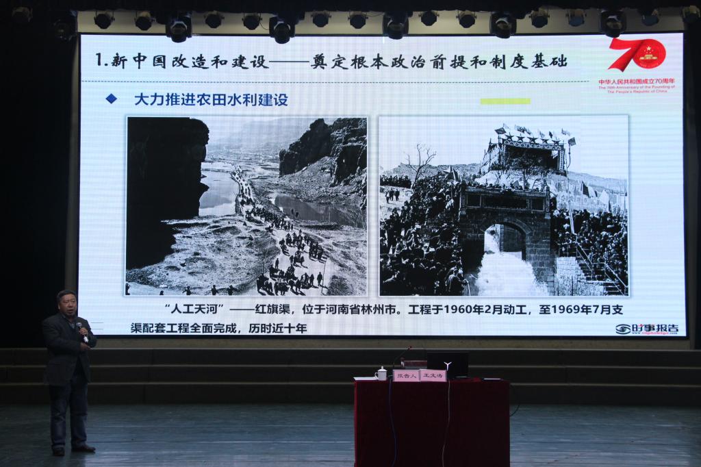 王文涛从不忘初心艰辛探索七十年、砥砺奋进铸就共和国辉煌、牢记使命开创美好新时代三个方面,回顾了峥嵘七十载新中国在政治、经济、社会、文化、生态五个方面取得的“中国奇迹”。