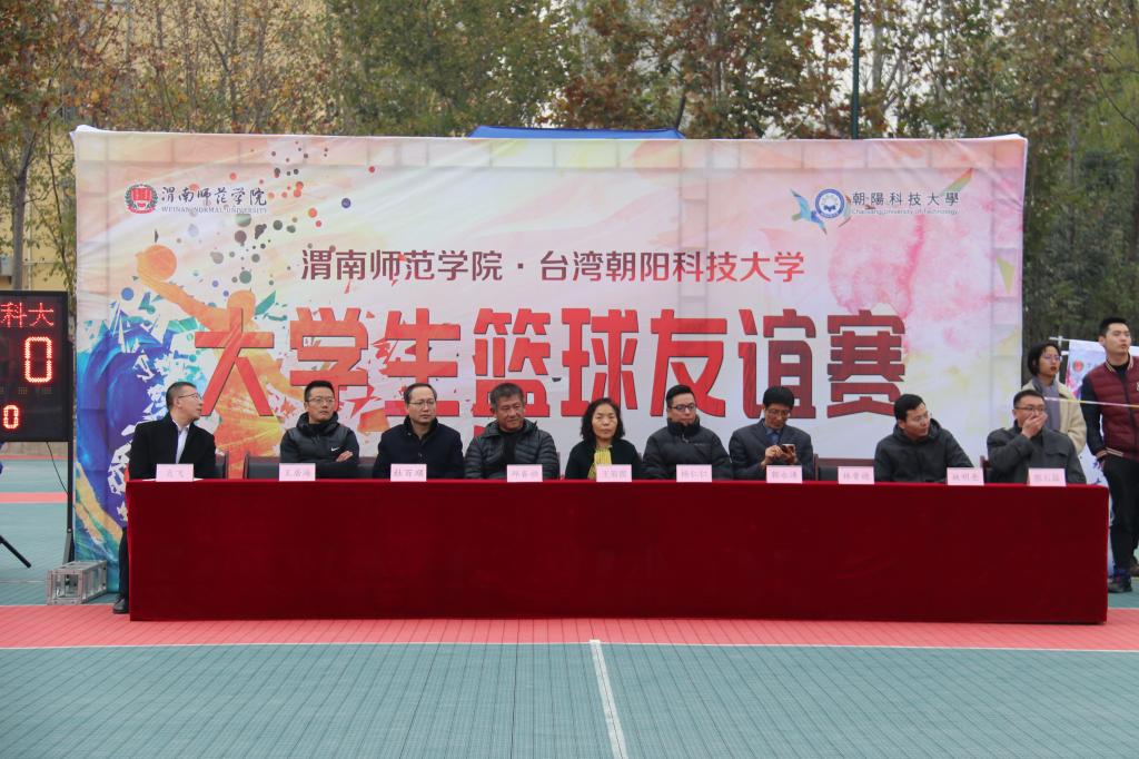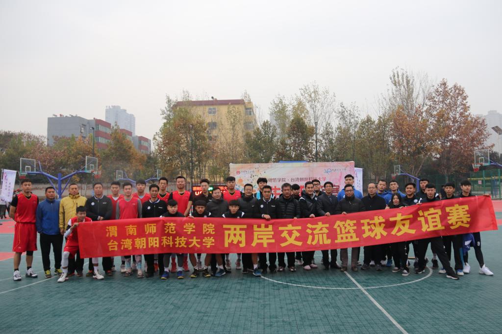 为响应“不忘初心,牢记使命”的主题教育,促进海峡两岸友好发展。11月20日下午,学校在篮球场举行与台湾朝阳科技大学“大学生篮球友谊赛”。朝阳科技大学教师林晋德、邱睿昶、杨仁仁,渭南市台湾事务办公室郭永涛,渭南师范学院副校长王菊霞,陕西铁路工程职业技术学院港澳台办主任王云波,渭南师范学院港澳台办主任杜百顺,团委书记姚明亮,体育学院院长王居海,团委副书记肖飞出席,台湾朝阳科技大学、渭南师范学院篮球队队员和两校的教练员、裁判员。活动由郭石磊主持。
