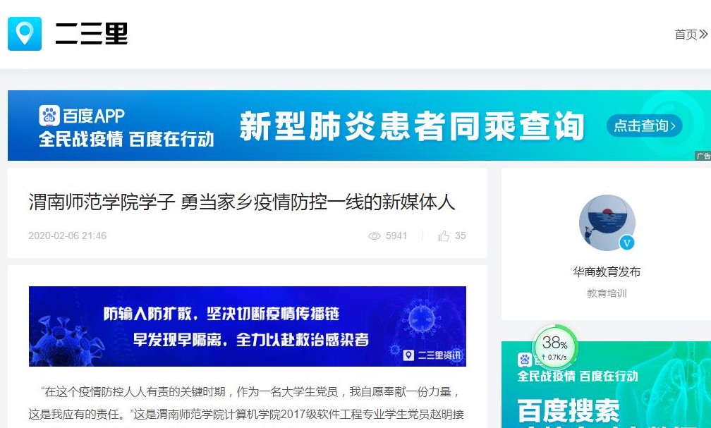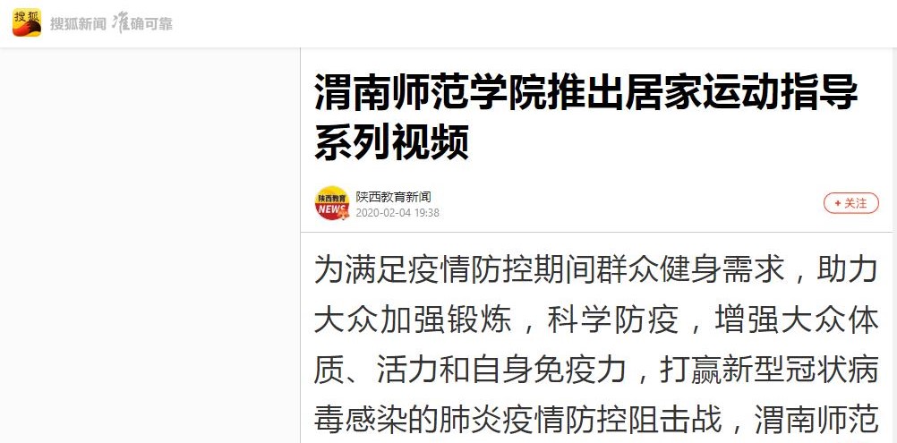 中国教育在线网站刊载了《打赢疫情防控阻击战:渭南师范学院“渭师心援”在行动》《渭南师范学院精准施策加强服务确保延期开学不误课》等12篇报道;搜狐教育刊载了《渭南师范学院推出居家运动指导系列视频》等9篇;网易陕西刊载了《渭南师范学院党员志愿者让初心在疫情防控一线熠熠生辉》等9篇;华商传媒集团“二三里”刊载了《渭南师范学院学子勇当家乡疫情防控一线的新媒体人》等6篇;“一点资讯”刊载了《我在湖北,向母校报平安——来自莫斯科艺术学院湖北籍学子的信》等9篇;今日头条转载了《守初心担使命疫情防控一线的“美丽逆行者”——师院社区支部书记刘丹》,还有多家媒体官方微博、微信公众号转载了我校相关报道。
