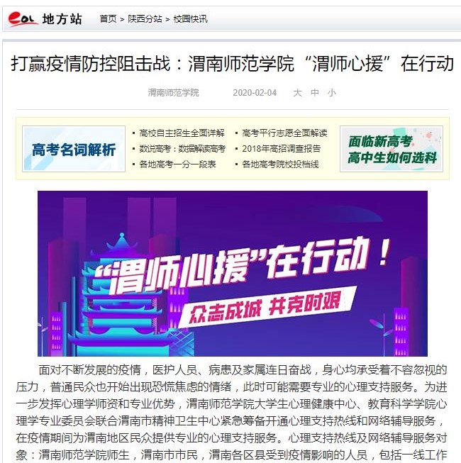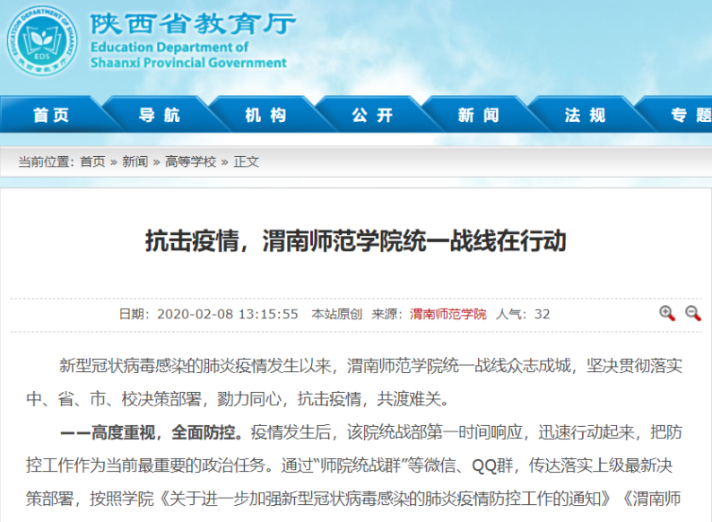 陕西省教育厅官网全文刊载了《渭南师范学院全方位做好新型冠状病毒感染肺炎疫情防控》《抗击疫情,渭南师范学院统一战线在行动》《渭南师范学院学生在全国各地疫情防控中发挥积极作用》《同心勠力 共克时艰 渭南师范学院师生在行动》《渭南师范学院后勤人员领命扛责坚守疫情防控保障服务一线》《战疫情 渭南师范学院青年与祖国同频共振》等6篇通讯。陕西省教育厅官方微博刊载了《渭南师范学院教师以笔书情,为抗击疫情助力》等3篇报道。