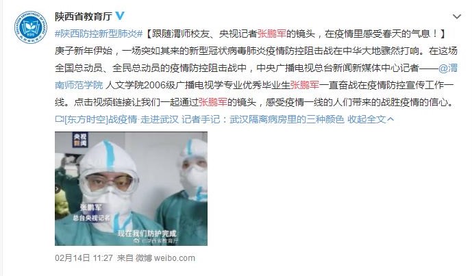 陕西省教育厅官方微博2月14日转载的《跟随渭师校友、央视记者张鹏军的镜头,在疫情里感受春天的气息!》下,网友们纷纷留言“我骄傲”“为学长点赞”“强”并加上竖起大拇指的符号等,向第一时间向组织申请要求到武汉一线去,从正月初一到现在从疫区一线持续发回准确可靠报道的我校人文学院2006级广播电视学专业优秀毕业生张鹏军,表达赞许与敬意。