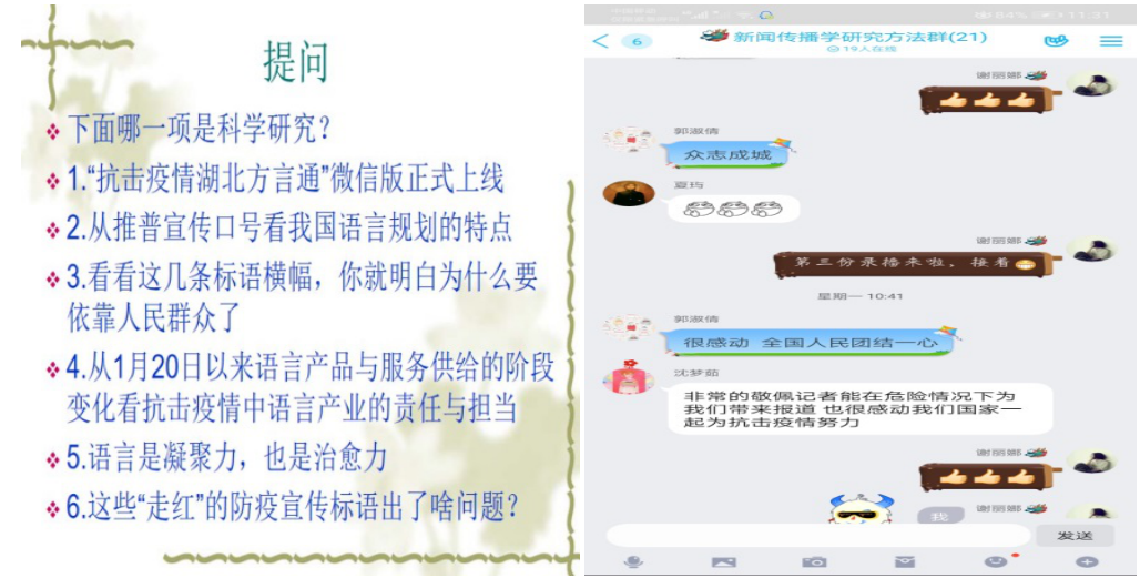谢丽娜老师的《新闻传播学研究方法》课程,采用在线慕课+录课+案例推送+任务清单+在线讨论的形式,紧扣专业,紧扣疫情,及时推送我院毕业生央视记者张鹏军在武汉一线的采访事迹,把疫情防控、课堂思政、专业知识和专业学习有机结合起来,收到了良好的效果。