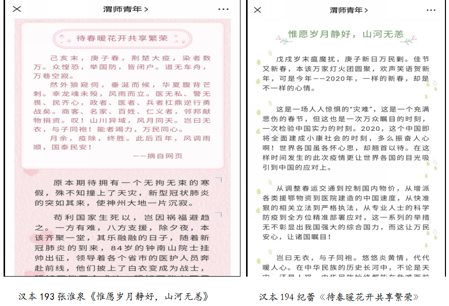 坚持“以文化人,以文育人”,全面坚守课堂主阵地,鼓励学生用多种多样的文学形式,创作战“疫”文学作品。引导学生体会抗疫过程中体现出的社会主义强大的制度优势,体会优秀传统文化在抗击疫情中迸发的精神力量;引导学生从宏观的国家决策层面和微观的优秀人物的感人事迹中,潜移默化接受教育,坚守制度自信和文化自信,凝聚中华之力和激励中华奋起的巨大力量。学生创作了大量的战“疫”诗文,发表在不同的网络平台上。