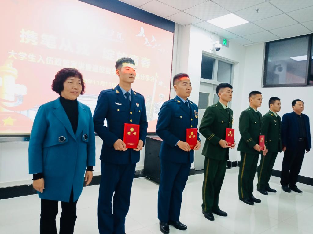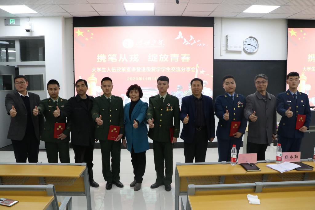 11月11日晚,传媒学院在富平校区教学楼130教室举办“携笔从戎、绽放青春”大学生入伍政策宣讲暨退役复学学生交流分享会。学校党委委员、副校长王菊霞参加活动。分享会由传媒学院党总支副书记刘永勤主持。
