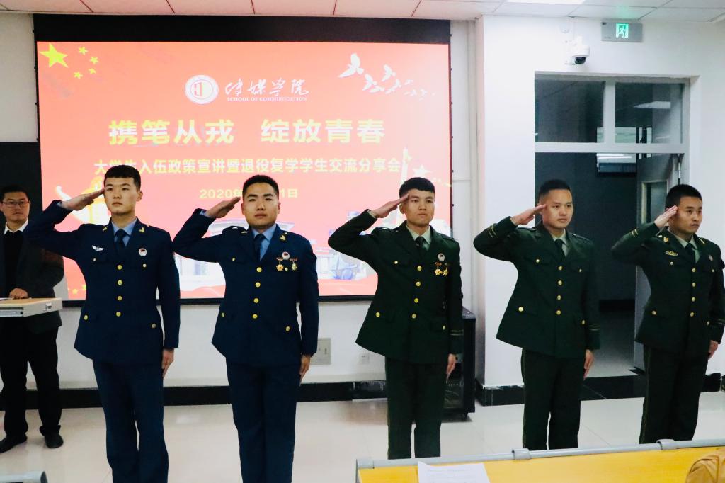 传媒学院退役复学学生代表钟桂江、汤小港、韩奇、高小松、杨韶烨围绕入伍前的想法、入伍后的生活、参军优待政策、军队生活对自己的意义等方面,分享他们的从军之梦、军人之路、报国之志。