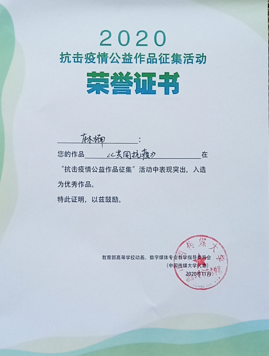 近日,教育部高等学校动画、数字媒体教学指导委员会发布了《抗击疫情公益作品征集活动百部优秀作品名单》,由我校传媒学院教师刘潇颖指导、数字媒体艺术专业学生麻楠创作的《共同抗疫》荣获优秀作品奖。