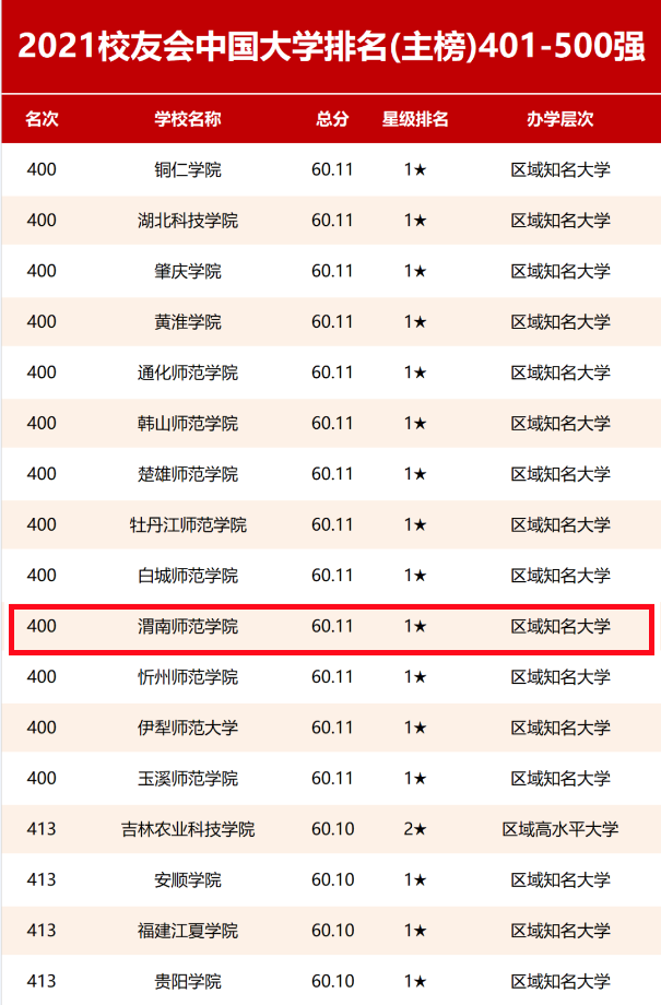 近日,全国第三方大学评价机构艾瑞深校友会网正式发布校友会2021中国大学排名,渭南师范学院位居400名,较去年提升31个名次。近年来,学校紧紧围绕“申硕升大”和建设特色鲜明的高水平地方师范大学发展目标,落实立德树人根本任务,深化教育教学综合改革,构建高水平人才培养体系,着力做强师范特色,不断提升学校治理能力和治理水平,持续推动学校内涵建设和高质量发展。