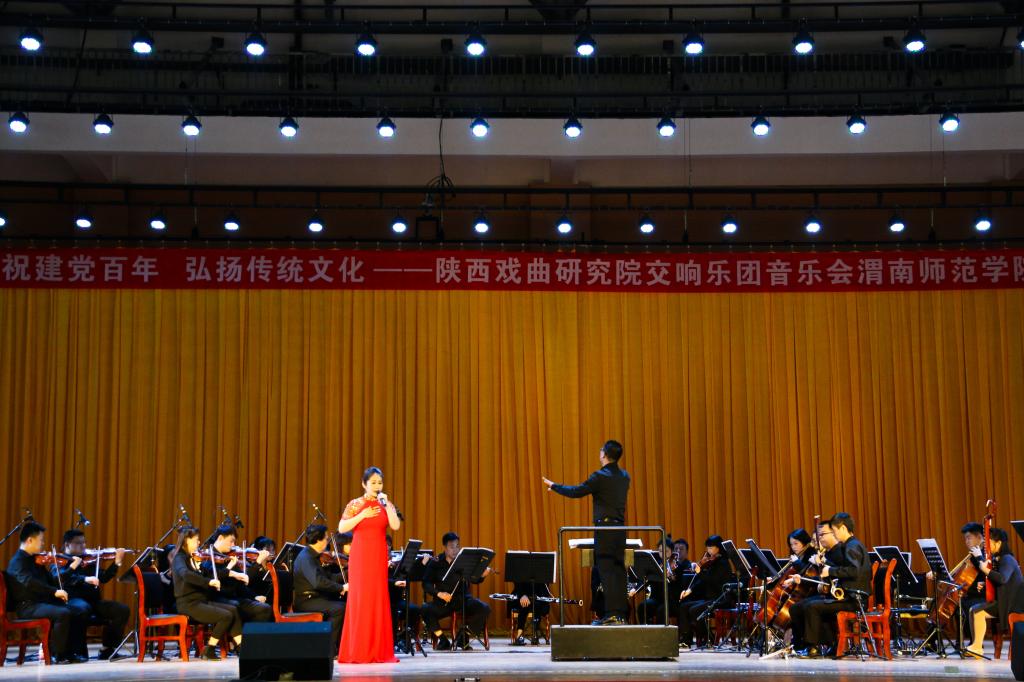 为庆祝党的百年华诞,大力弘扬优秀传统文化,4月27日下午,陕西戏曲研究院交响乐团音乐会渭南师范学院专场演出在学校富平校区举办。党委副书记任健出席并观看演出,学工部、富平校区管委会、后勤服务中心、美术学院、传媒学院等相关部门负责人及师生代表共300余人现场观看聆听。