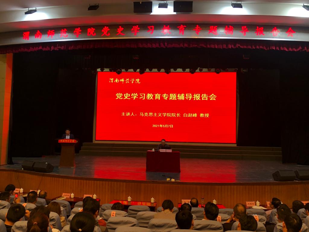 5月7日下午,我校围绕“深刻感悟中国共产党始终不渝为人民的初心宗旨”举办党史学习教育专题辅导报告会。学校党史学习教育宣讲团成员、马克思主义学院院长白赵峰教授作了题为《以中国梦擘画复兴蓝图》的辅导报告。省委党史学习教育第十三巡回指导组一行莅临报告会现场旁听指导。