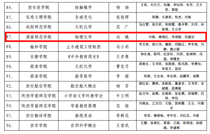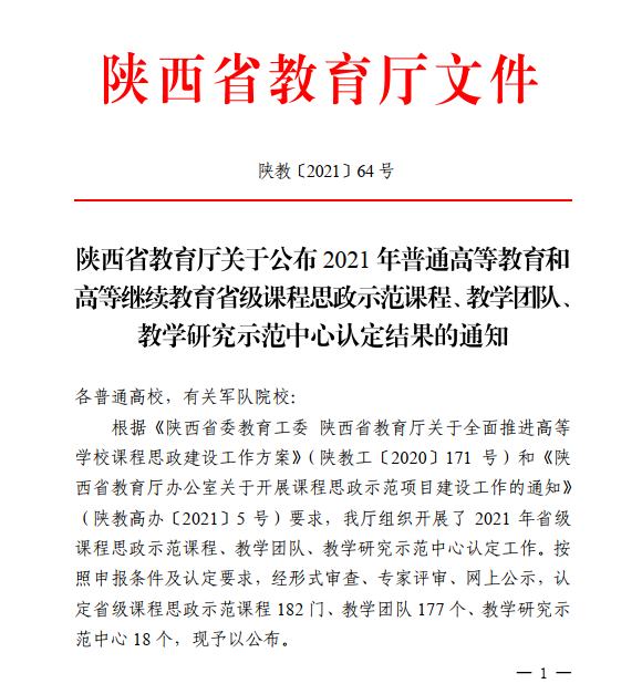 近日,陕西省教育厅公布了《陕西省教育厅关于公布2021年普通高等教育和高等继续教育省级课程思政示范课程、教学团队、教学研究示范中心认定结果的通知》(陕教〔2021〕64号)。经形式审查、专家评审、网上公示等程序,我校化学与材料学院刘艳负责的《物理化学》被认定为省级课程思政示范课程,物理化学教学团队被认定为省级教学团队。