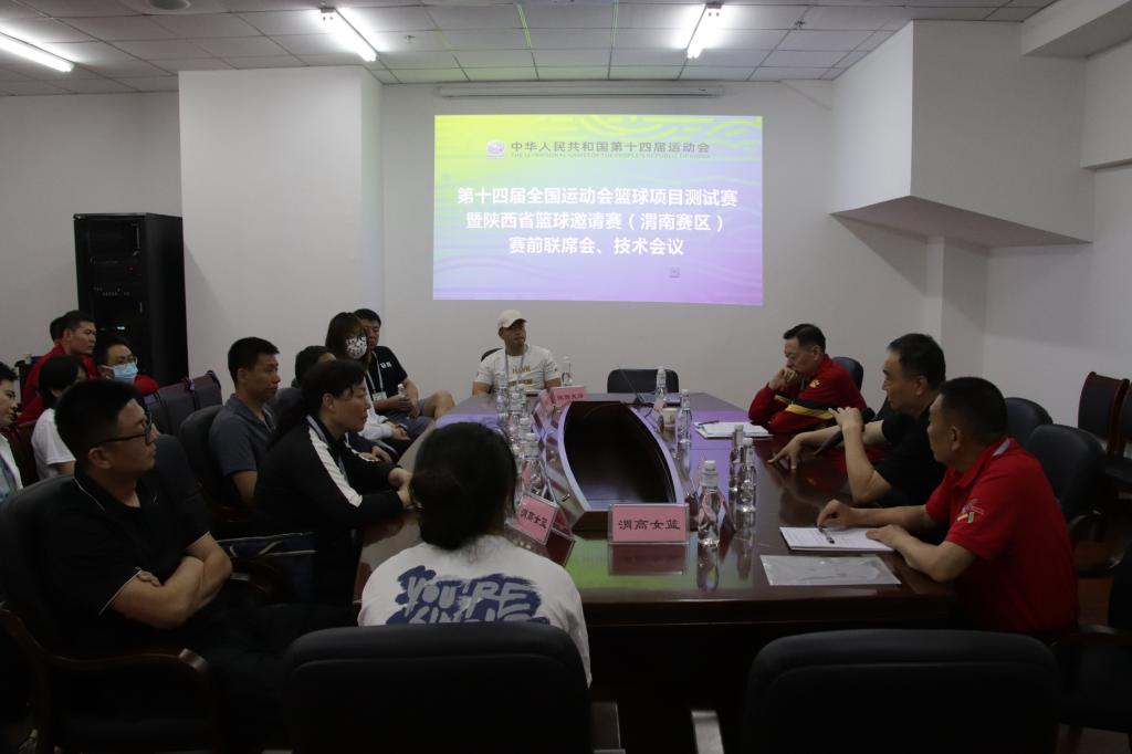 5月21日,第十四届全国运动会篮球项目测试赛暨陕西省篮球邀请赛(渭南赛区)赛前联席会与技术会议在渭南师范学院云帆体育馆召开。四支参赛队伍主教练与队员、裁判员、辅助裁判员等40余人参加会议。