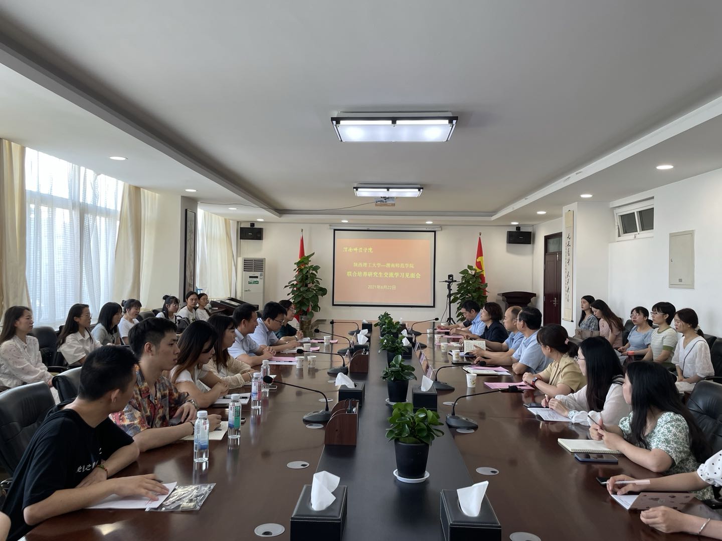 6月22日上午,我校举行陕西理工大学与渭南师范学院研究生联合培养示范工作站联合培养研究生交流学习见面会,副校长卢爱刚出席会议并讲话,陕西理工大学研究生院副院长赵莉,人文学院院长李宜蓬、副院长徐向阳,我校人文学院副院长赵前明、张瑞芳,研究生指导教师陶生魁、刘鑫等人以及陕西理工大学32名交流学习的学生参加会议。会议由学科建设办公室主任袁梁主持。