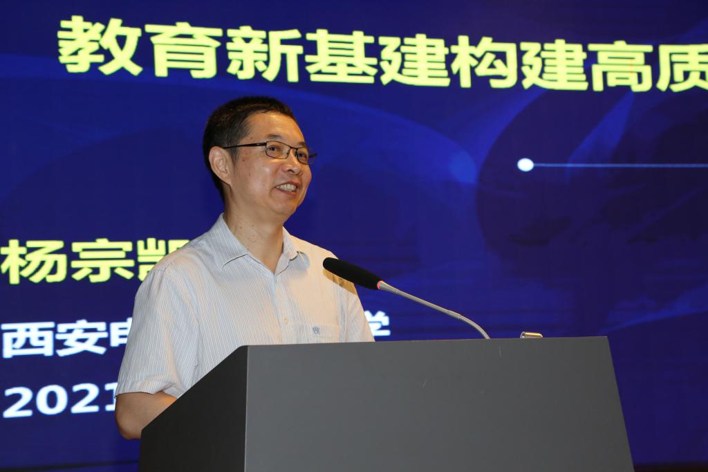 开班仪式后,杨宗凯教授以《教育新基建构建高质量教育支撑体系——以西安电子科技大学为例》为题作了首场专题报告,他强调,教育信息化是一项复杂的系统性工程,教育思想观念要从以教为主向以学为主转变;要明确课堂重在培养学生协作、沟通、思辨、创新能力的定位;搭建智慧物理空间与在线学习空间的双空间相结合的教室教学环境;重塑教育评价,关注学生增值性能力评价与学业评价。