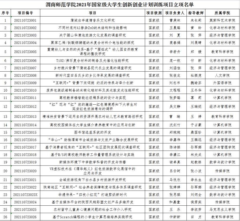 近日,教育部下发了《关于公布2021年国家级大学生创新创业训练计划项目和重点支持领域项目名单的通知》(教高司函〔2021〕13号),我校《蒲城白羊道情音乐文化研究》等26个项目获批2021年国家级大学生创新创业训练计划项目立项。