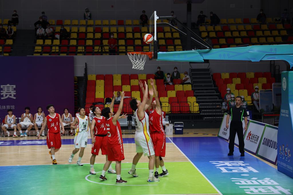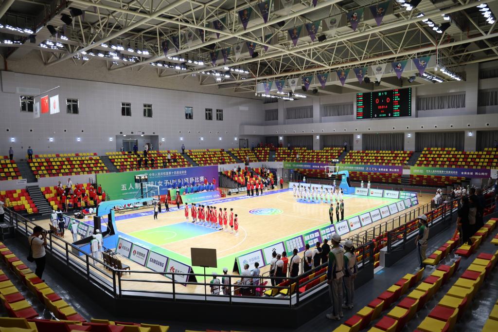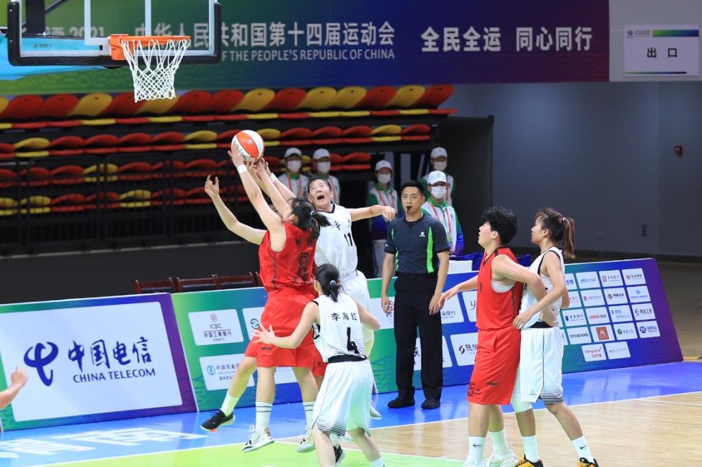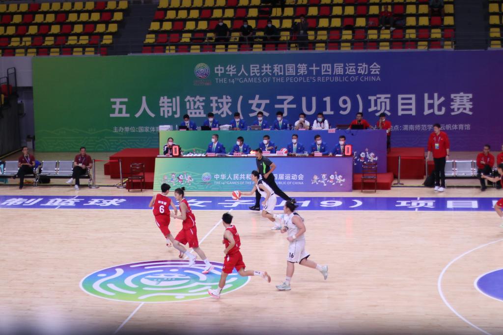 9月17日上午,第十四届全运会篮球女子五人制U19组比赛在渭南师范学院云帆体育馆火热开赛。
