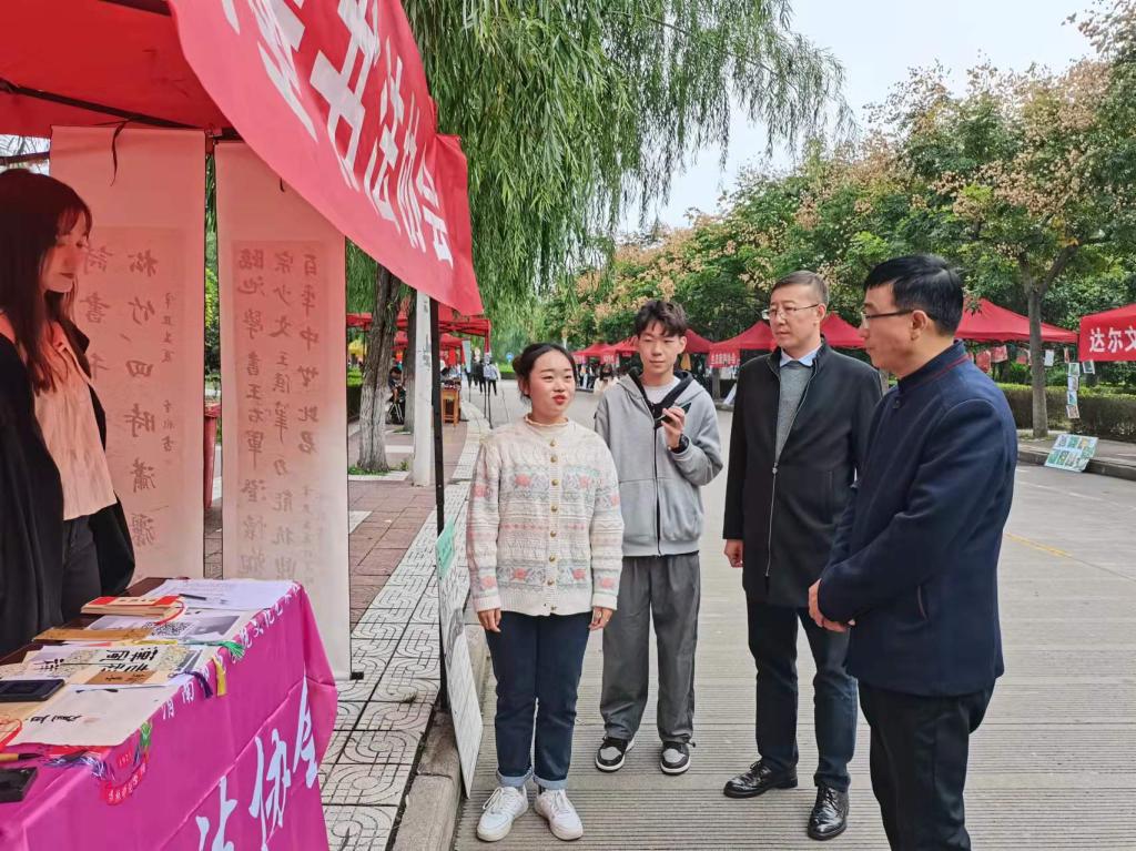 10月12日至14日,我校大学生社团在九思环路开展新学年纳新活动。校党委副书记韩小卫现场指导调研社团纳新工作,团委副书记肖飞、刘娟宁陪同调研。