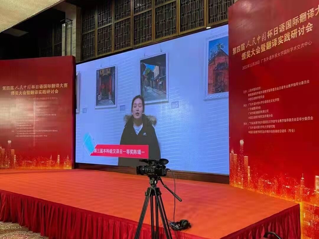 11月28日晚,第四届人民中国杯日语国际翻译大赛比赛结果揭晓,我校外国语学院日语教师原林书指导的2018级日语专业4名学生在本次大赛中表现优异,共获得6个奖项。颁奖大会上,去年一等奖获奖选手我校陈靖一同学代表我校致辞。