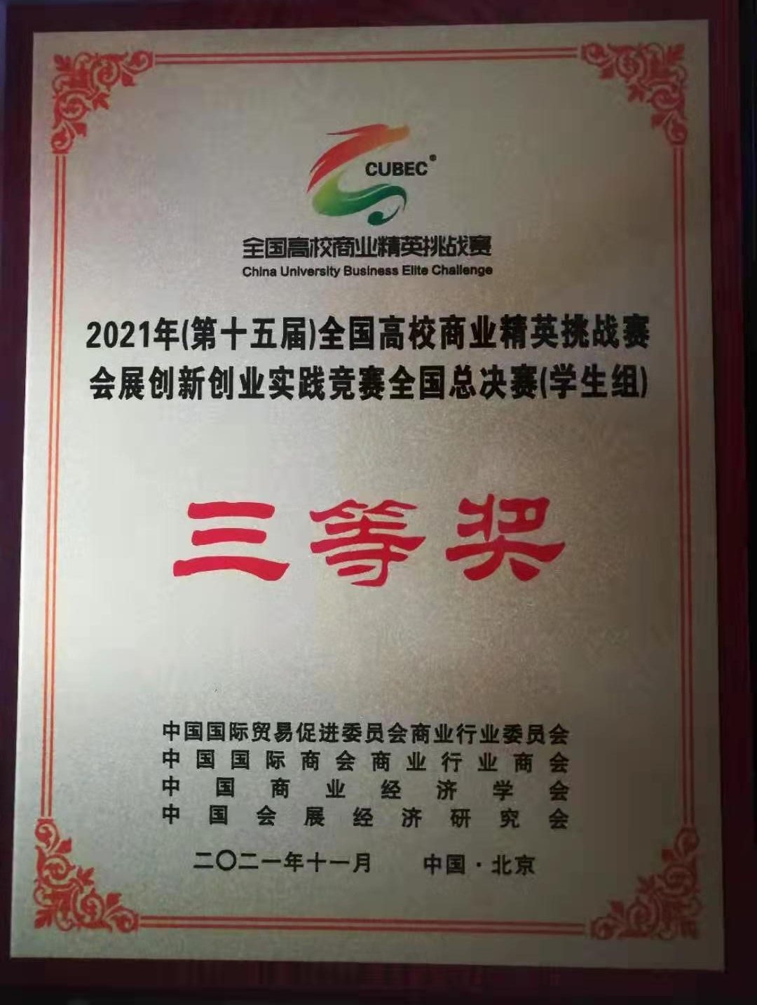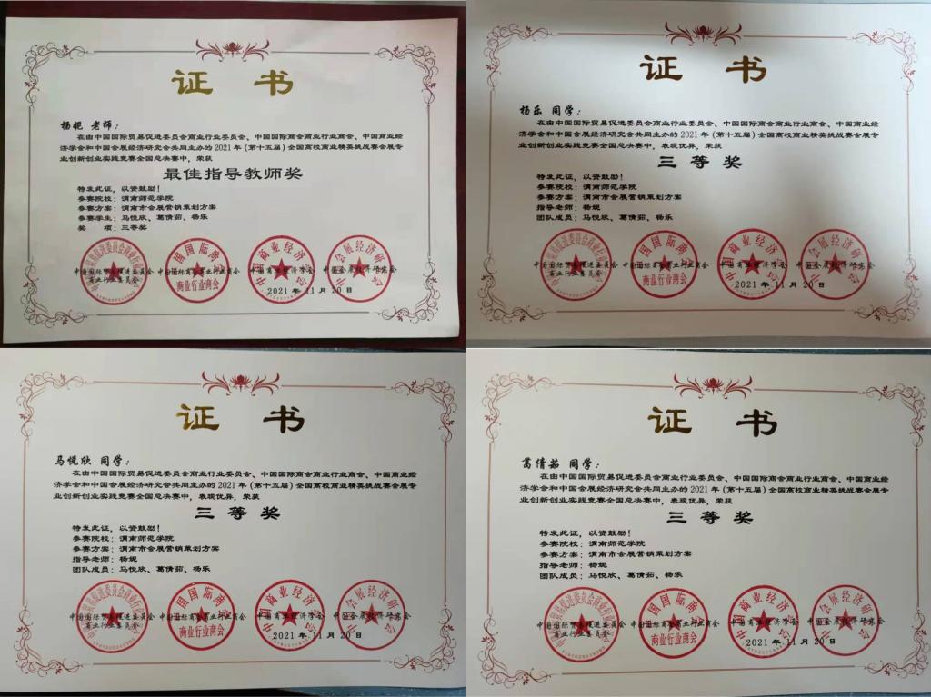 近期,由中国国际贸易促进委员会主办的“2021年全国高校商业精英挑战赛会展创新创业实践竞赛全国总决赛”在线上成功举办,我校经济与管理学院旅游管理专业2018级学生马悦欣、葛倩茹、杨乐组成的“晨旭”队作品《渭南市会展营销策划方案》获得三等奖,经济与管理学院教师杨妮获得最佳指导教师奖。