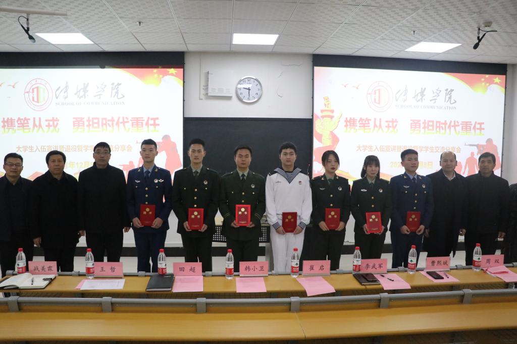会上观看了《传媒学院退役士兵风采》视频,聘任杨韶烨、皱乐等7名学生为传媒学院“征兵宣传员”,并为他们颁发聘书。征兵宣传员主要负责开展大学生征兵政策的宣传工作,聘期一年。