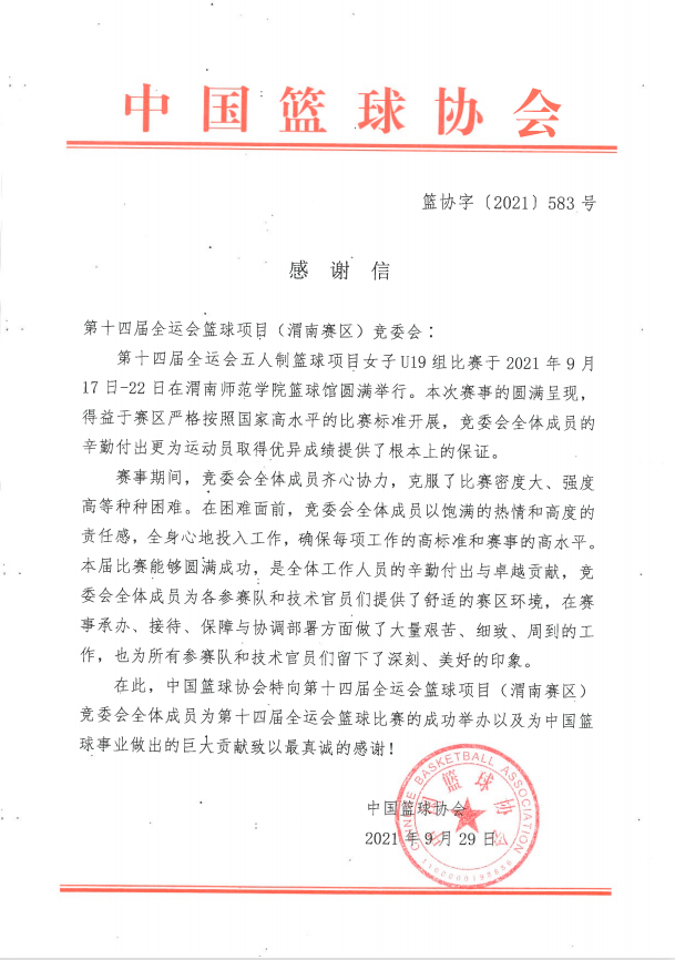 近日,中国篮球协会向第十四届全运会篮球项目(渭南赛区)竞委会发来感谢信,信中对我校在9月17日至22日期间承办的第十四届全国运动会女子篮球五人制U19组比赛中所做的各项工作及对中国篮球事业做出的贡献表示感谢。同时,中国篮协主席姚明为我校赠送中国篮球协会纪念旗并亲笔签名。