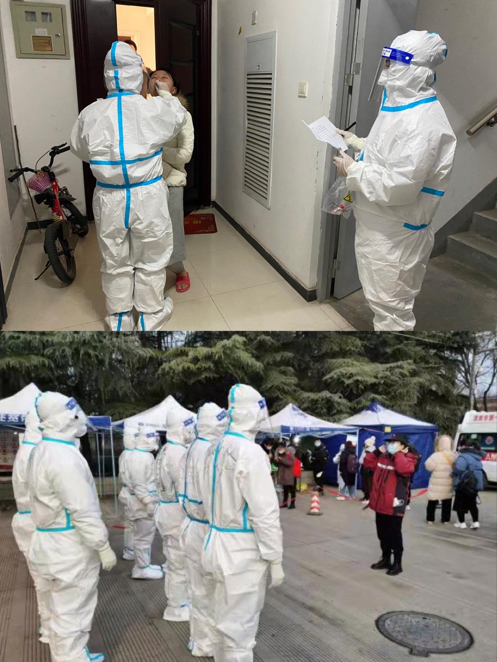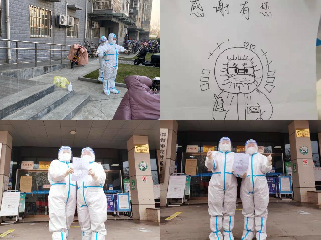 随着核酸检测时间的不断调整,在封闭管理期间,附属医院医护人员主动承担起校内重点人群的核酸检测采集工作,他们的身影时常穿梭于教学区和学生公寓区的各个楼宇之间。为了不让师生在寒冷环境下等待,附属医院联合后勤服务中心不断优化采样流程,多次更换采样地点,增派采样人员,积极联系团委和体育学院志愿者协助,保证采样工作组织有序。因附属医院人员有限,常有医护人员在医院完成夜班医疗工作没有休息直接参加采样。每采一个样本手部必须消毒一次,每消毒一次就降温一次,直到手失去知觉,他们依然坚持。寒风中,夜幕下,他们用自己冻的不太灵活的手,认真负责、及时规范地为师生采样,而每次完成采集后,师生的一句“谢谢”“您辛苦了”,都让他们倍感值得。附属医院医护人员每天都奋战在各个核酸采样点,他们迎难而上、全力以赴,每天穿上防护服,一工作就是3、4个小时,不能如厕不能吃喝,手脚冻到麻木,脸庞满是勒痕,起雾的护目镜闷得透不过气,也毫无怨言,因为他们知道,必须与时间赛跑,与病毒较量,打赢这场“战争”,保障师生健康。