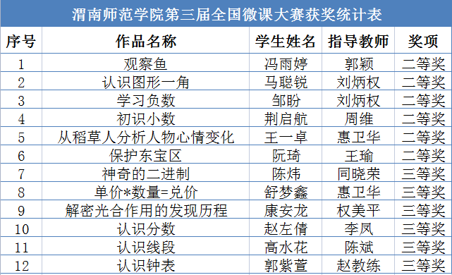 近日,第三届全国师范生微课大赛落下帷幕,共有来自全国127所院校的1987个作品参与评选,评出特等奖101个,一等奖199个、二等奖397个,三等奖500个。我校推荐了20个微课作品参赛,12个作品获奖,其中获二等奖6项、三等奖6项。