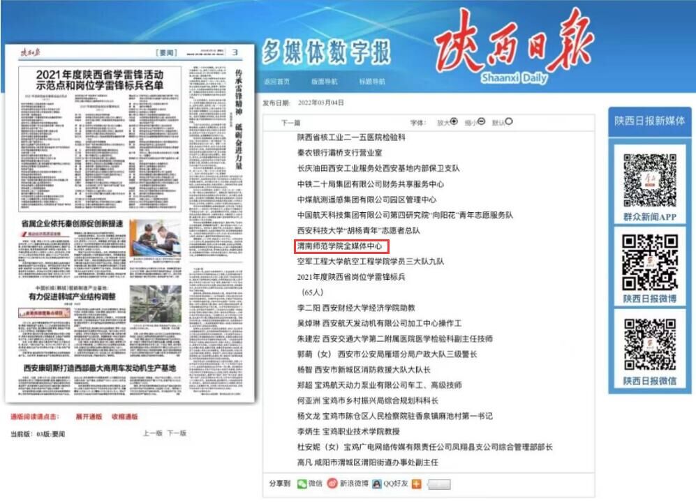 在3月5日学雷锋日来临之际,中共陕西省委宣传部发布《关于命名2021年度学雷锋活动示范点和岗位学雷锋标兵的决定》,我校全媒体中心荣获2021年度全省学雷锋活动示范点,全省仅两家高校获得。