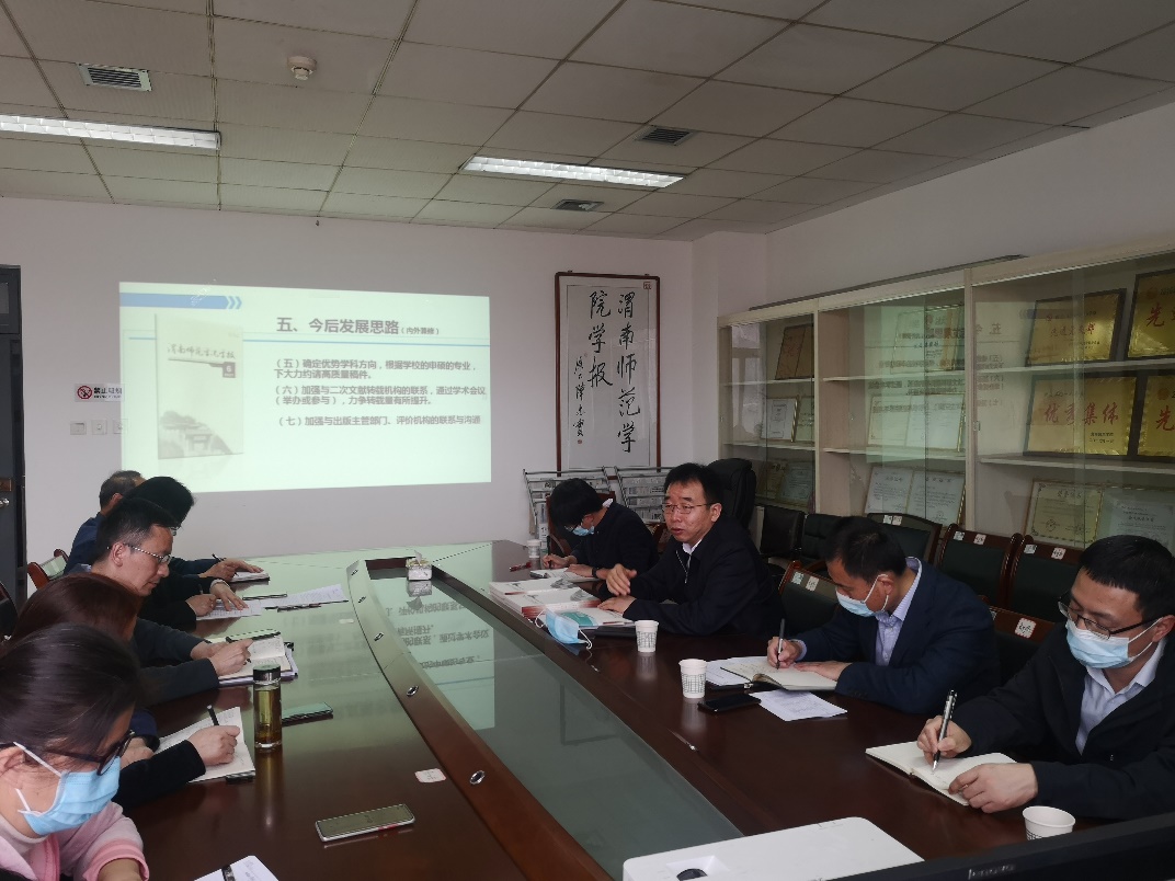 张守华听取了学报编辑部的工作汇报。他肯定了学报的办刊成绩,鼓励学报的同志们认真总结办刊经验。他要求,要坚持正确的政治方向、出版导向和价值取向,紧紧围绕办刊宗旨做好选题,服务于经济社会发展和师范教育;要建设好教育部名栏“司马迁与《史记》研究”,赋予栏目新的时代使命,从历史研究中汲取对当下和未来有益的精神元素;要结合陕西、渭南、学校发展的实际树立期刊发展的阶段性目标,主动谋划工作,主动推送期刊和优秀论文。