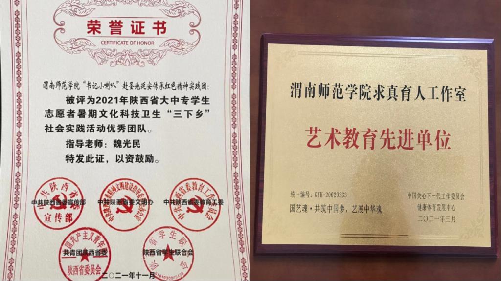 2021年以来,“书记小喇叭”先后荣获全国关心下一代工作委员会艺术教育先进单位,中国教育学会网络育人优秀教育成果一等奖,被陕西省教工委评为2021年全省高校学生工作精品项目,入选渭南市基层党建经典案例。2021年暑假组织的“书记小喇叭”赴圣地延安传承红色精神实践团,被中共陕西省委宣传部等单位评为陕西省大中专学生志愿者暑期文化科技卫生“三下乡”社会实践活动优秀团队,实践团推出的社会实践联播快讯被陕西省高校网络思想政治工作中心评为“人气资讯奖”。在学校组织的各项评奖中,该栏目被评为2020年校园文化建设成果一等奖,荣获学校2019年新媒体“特色栏目”。“求真育人”工作室负责人魏光民同志被中共渭南市委评为“学习党的创新理论先进个人”,被多家媒体称为“校园里的快板书记”。