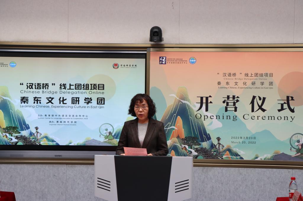 渭南师范学院副校长王菊霞,人文学院院长赵前明,授课教师代表宋引秀、陈西洁、王淑莉、卜晓梅、张静莉等出席开营仪式。项目团队其他主讲教师、学生助教以及200余名来自俄罗斯、泰国、韩国、柬埔寨、越南和老挝等国高校和中学的营员线上参加本次活动。开营仪式由国际教育学院院长杜百顺主持。