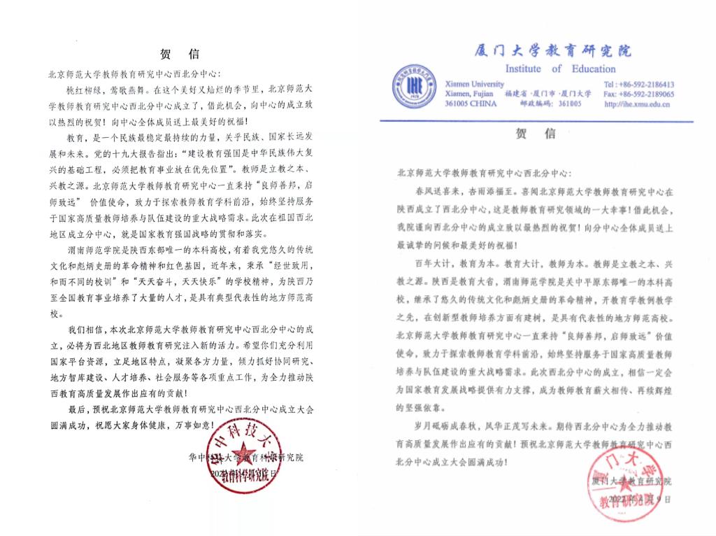 全国教育学科唯一的一流学科建设点厦门大学教育研究院专门发来贺信,高等教育学术重镇华中科技大学教育科学研究院以及北京师范大学教师教育研究中心十四个分中心也发来贺信表达祝贺。