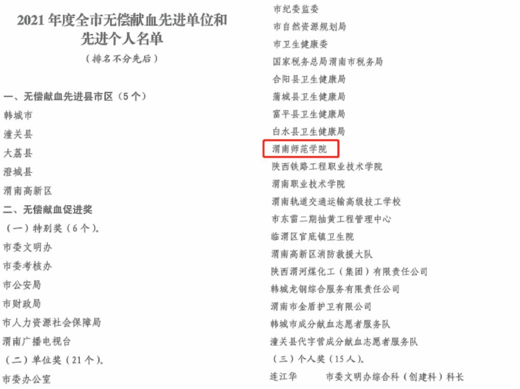 近日,渭南市人民政府办公室下发的《关于表彰2021年度全市无偿献血先进单位和先进个人的通报》中,我校被评为“2021年度渭南市无偿献血促进单位”。