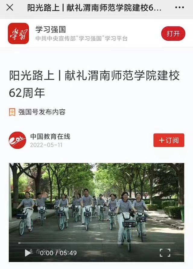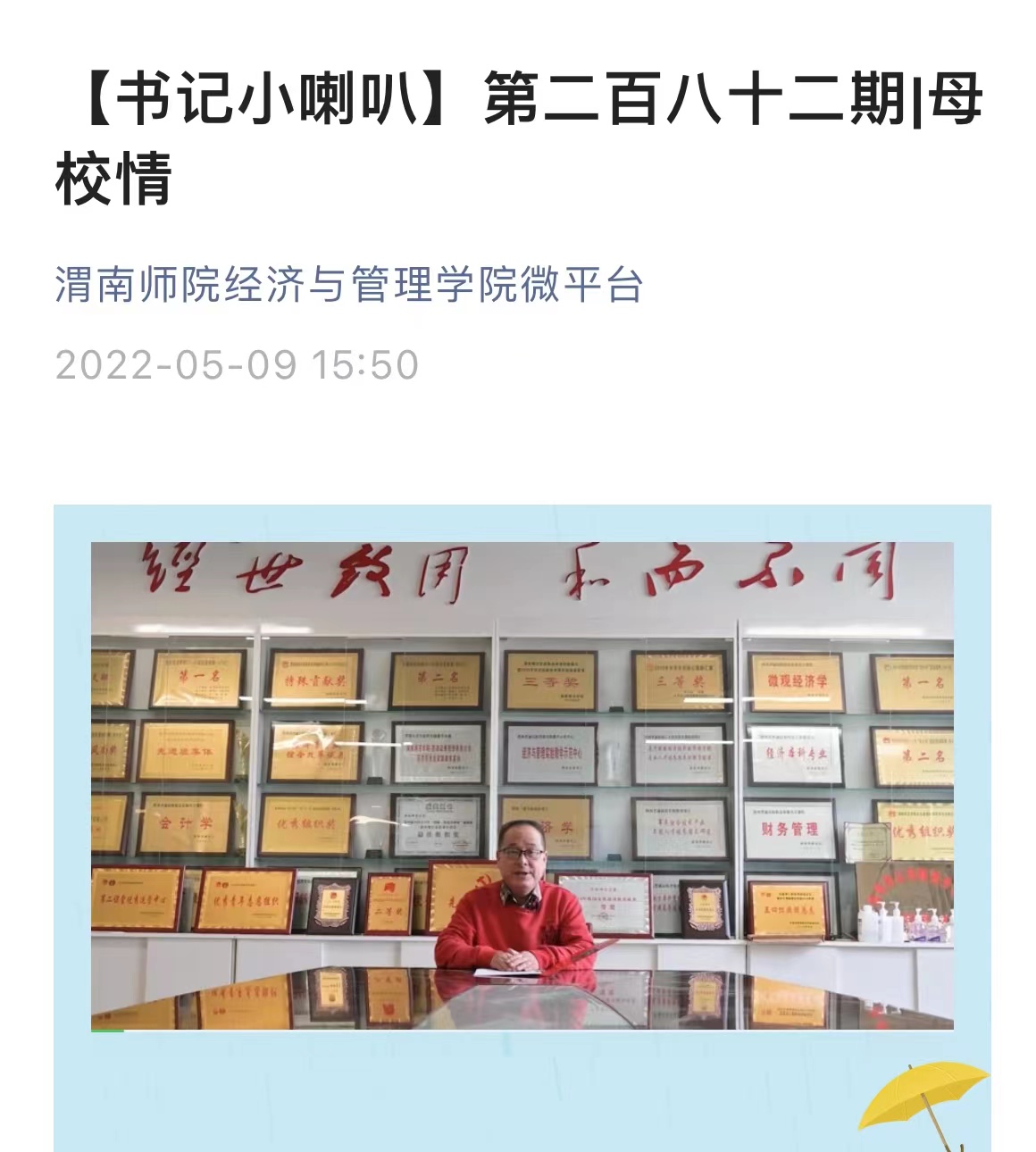 “书记小喇叭”写新篇。“书记小喇叭”校庆日推出新作《母校情》,表达了渭师走过的62个春秋,情系育人梦,桃李满天下,谱写了一曲立德树人的动人凯歌。