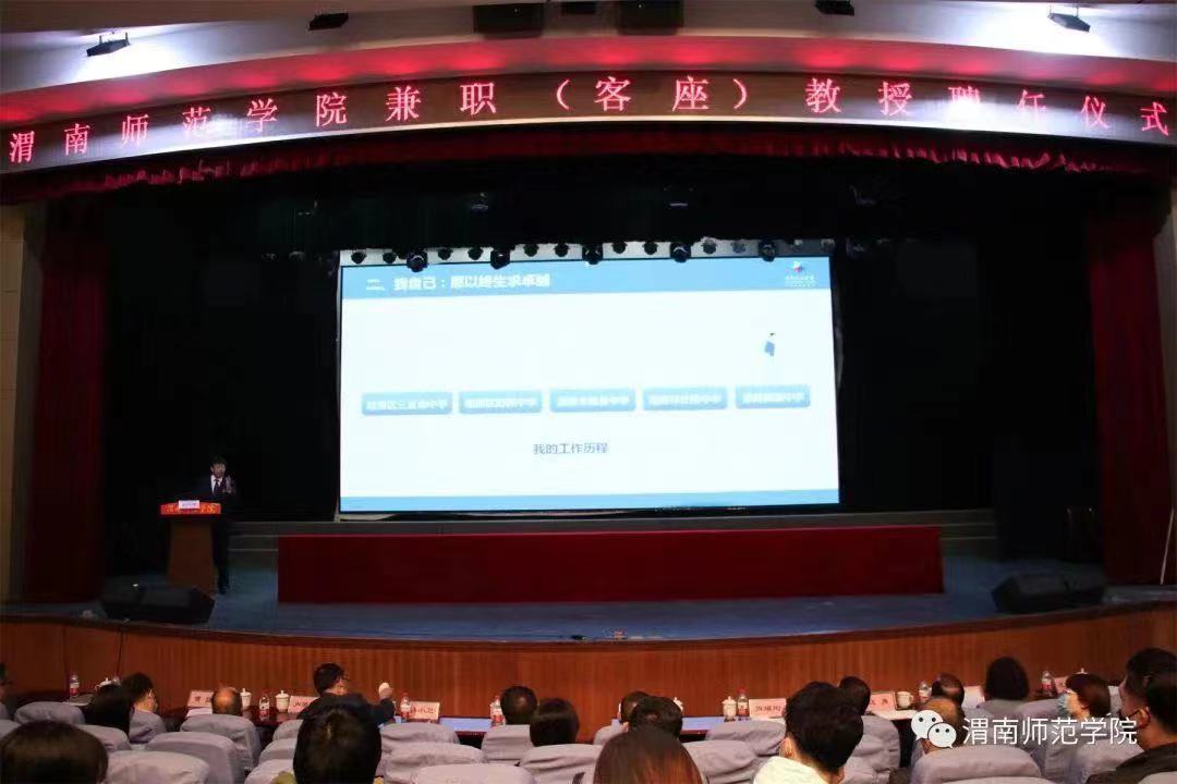 渭南高级中学校长、全国优秀教师姜小卫为学校党委委员、二级学院院长及各专业师范生代表作了题为《做追求卓越的教育新人》的报告;渭南小学校长、全国模范教师郗莉,澄城中学校长王会香分别为人文学院师范生作了题为《适性教育引领发展微笑课堂共生共长》《卓越青年教师成长力构建》的报告;渭南高级中学、全国优秀教师张华文,合阳中学英语教师王军玲分别为外国语学院师范生作了题为《教书育人的故事》《感受幸福 静待花开》的报告;渭南中学校长马根福为化学与材料学院师范生作了题为《挑战未来,你准备好了吗?》的报告;富平迤山中学校长赵和平,杜桥中学校长贺启发,渭南高新中学校长孙佑治,澄城城关中学校长鲁九云分别为物理与电气工程学院师范生作了题为《教师这个职业就很好》《精准目标叙写 打造高效课堂》《让精彩发生在重点突破的时候》《信息化促进基础教育改革》的报告;渭南高级中学教师张娟为音乐学院师范生作了题为《创新性传承中华优秀传统文化之“礼乐弦歌”——“鸣鸠琴”》的报告;宜川中学教育集团总校长徐兴国为马克思主义学院师范生作了题为《用“爱心和责任”谱写教育之歌》的报告;西安市高新第一学校副校长车大鹏为数学与统计学院师范生作了题为《爱与榜样成就卓越教师》的报告。