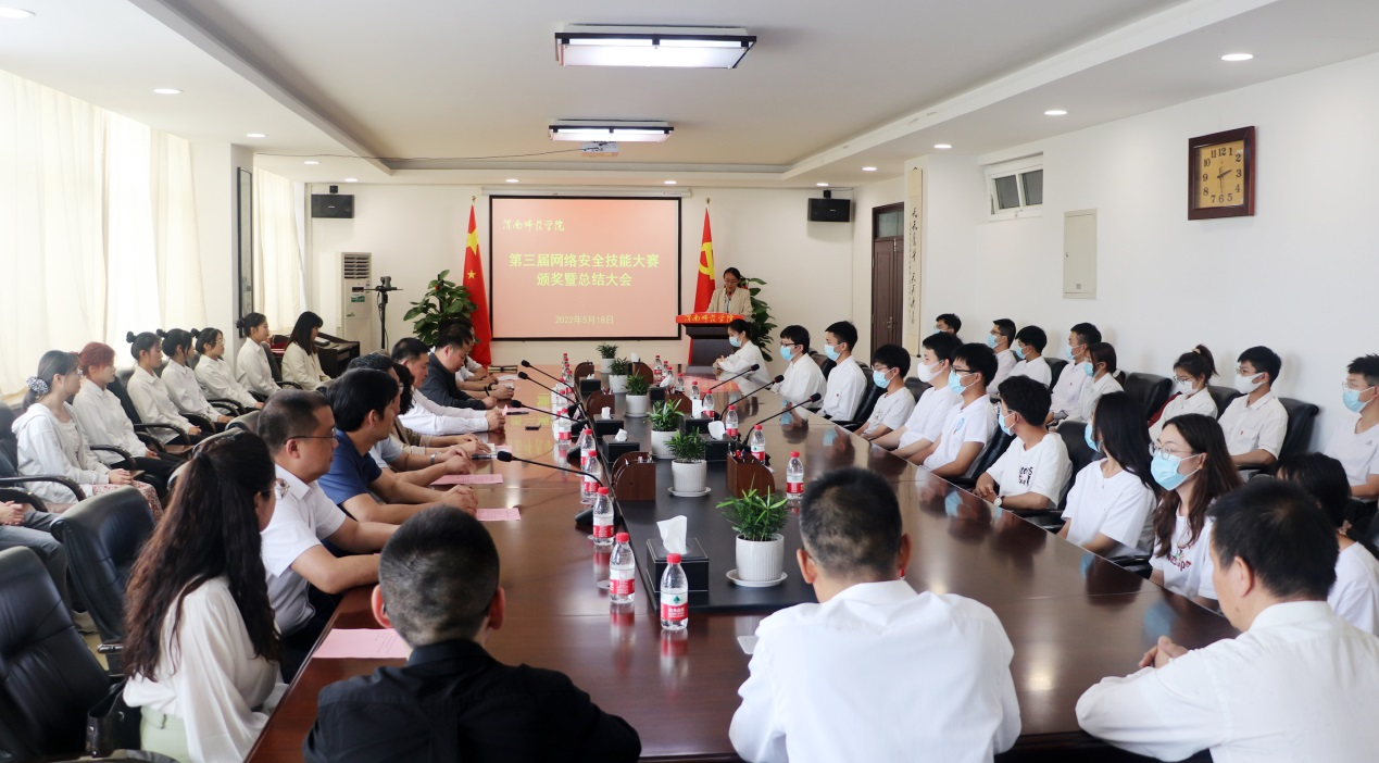 5月18日下午,由学校团委主办、计算机学院承办的渭南师范学院第三届网络安全技能大赛颁奖暨总结大会在厚德楼第二会议室举行。学校党委书记卓宇、党委副书记汪勇、副校长王菊霞出席大会,团委副书记肖飞、计算机学院党政负责人、各专业建设负责人、获奖学生等参加大会。大会由计算机学院党总支副书记武楠主持。
