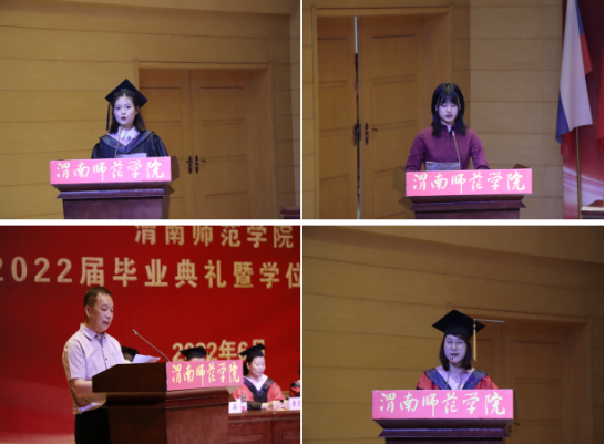 随后,2018级毕业生代表、在校生代表、毕业生家长代表、教师代表依次发言,大家表示,感谢学校和学院对大家的悉心培养和教育,寄语同学们要不忘勤奋、不失勤劳、关注时政、树牢三观、广学博识、全面发展,让个人梦想与中华民族伟大复兴紧密相连,成为奔跑在新时代前列的踏浪者、追梦人。