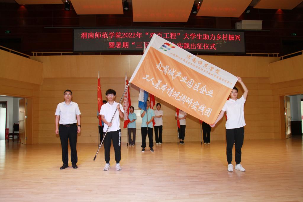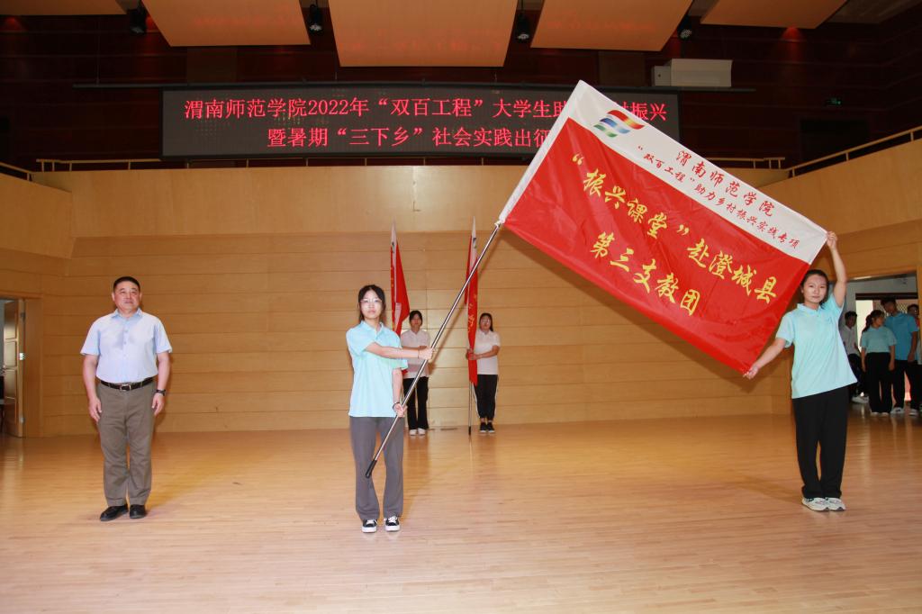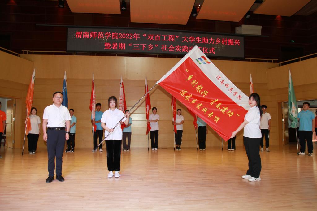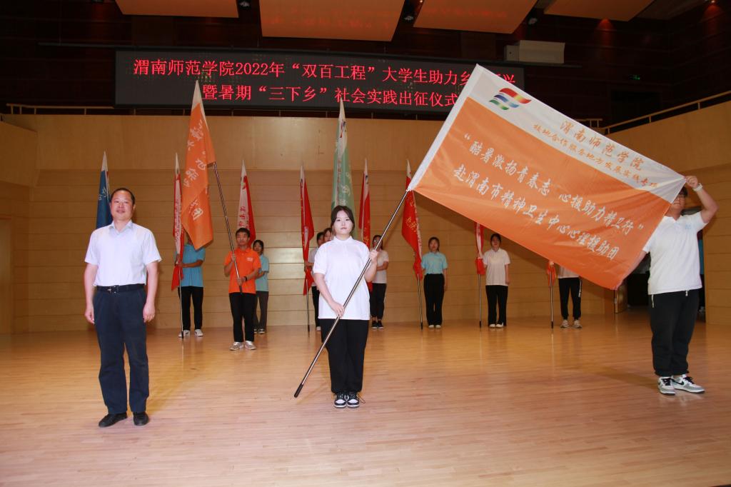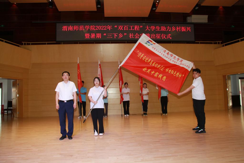 与会领导分别为校级重点团队“双百工程”助力乡村振兴专项实践团,沿着习近平总书记的足迹体悟红色精神专项实践团,小我融入大我青春献给祖国助力渭南地区发展专项实践团,校地合作服务地方发展专项实践团授旗。党委书记卓宇宣布社会实践出征。