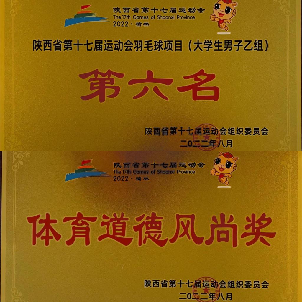 7月31日至8月3日,我校羽毛球代表队参加陕西省第十七届运动会羽毛球大学生组比赛,荣获乙组男团第六名和体育道德风尚奖。