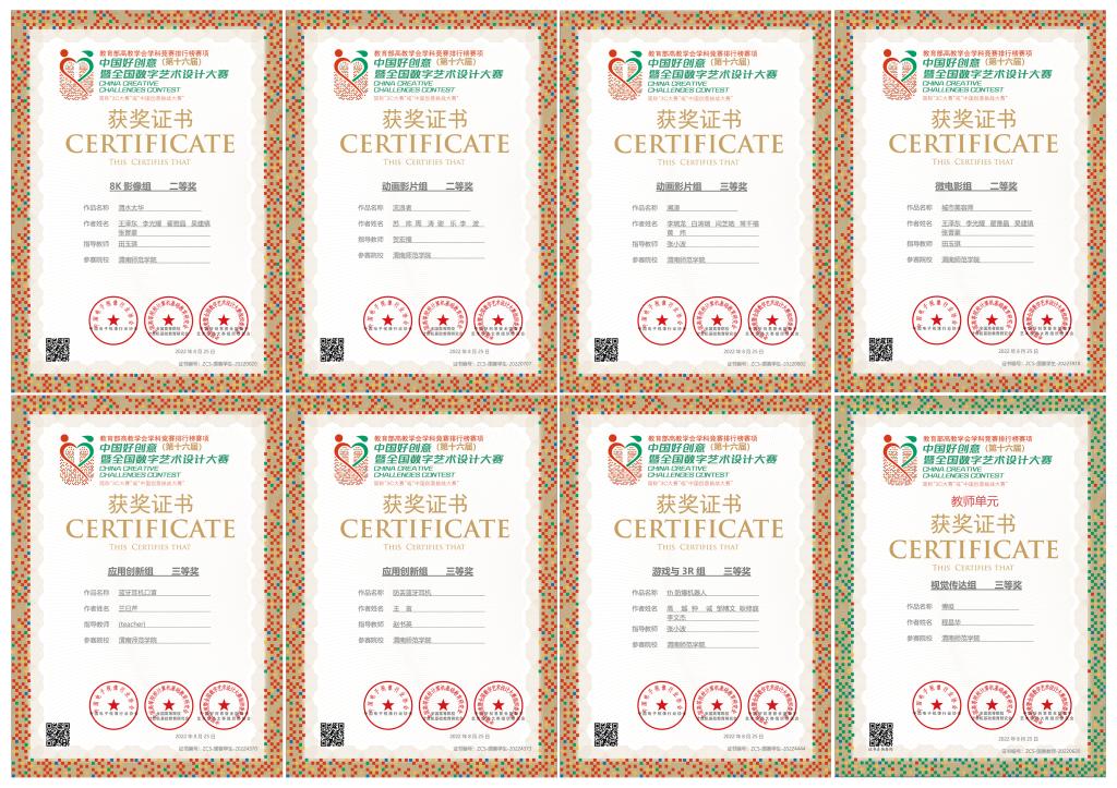 8月25日,中国好创意暨全国数字艺术设计大赛国赛获奖名单发布,我校传媒学院共有8个项目在动画影片组、8K影像组、微电影组、应用创新组、游戏与3R组和教师组中进入全国总决赛,其中贺宏福、田玉琪老师指导的作品荣获国家级二等奖3项,张小波、程昌华、赵书英老师指导的作品荣获三等奖4项,程昌华老师的作品荣获教师组三等奖。同时,我校荣获优秀组织奖。