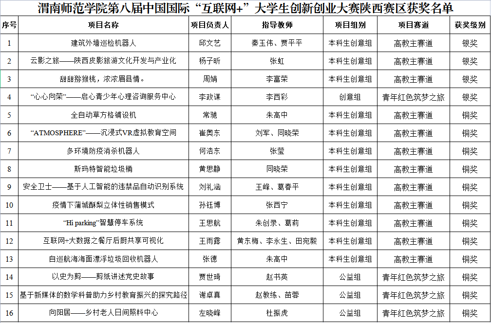 9月13日,陕西省教育厅发布了《关于公布第八届中国国际“互联网+”大学生创新创业大赛陕西赛区获奖名单的通知》,我校共有16个项目获奖,其中,高教主赛道获得银奖3项、铜奖9项;青年红色筑梦之旅赛道获得银奖1项,铜奖3项。