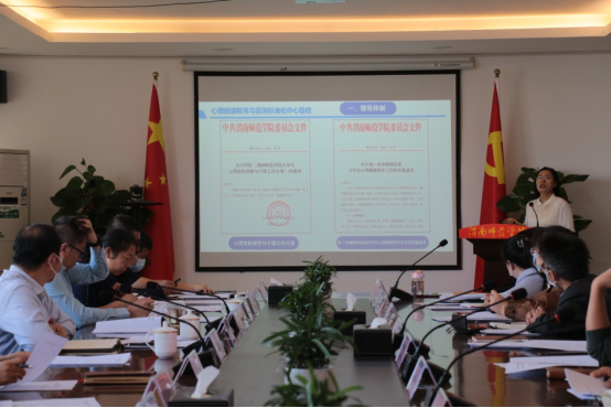大学生心理健康教育指导中心主任刘原向领导小组汇报陕西省高校心理健康教育与咨询中心标准化验收准备工作,针对实地验收的8个一级指标和26个二级指标的准备情况做了详细汇报。随后,各部门对陕西省高校心理健康教育与咨询中心标准化验收工作准备工作提出意见和建议。刘原向领导小组汇报开学以来,新生心理测评,大学生心理健康教育课程教学以及疫情防控常态化大学生心理问题防治等工作。
