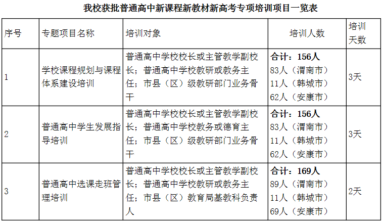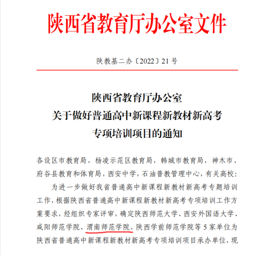 9月30日,陕西省教育厅办公室发布了《关于做好普通高中新课程新教材新高考专项培训项目的通知》(陕教基二办〔2022〕21 号),全省共5家单位被确定为承办单位,我校成功入选,承担培训人数481人。这是省教育厅首次设立该项目。