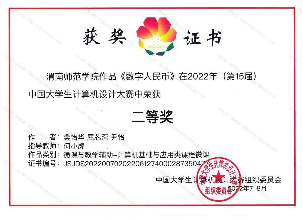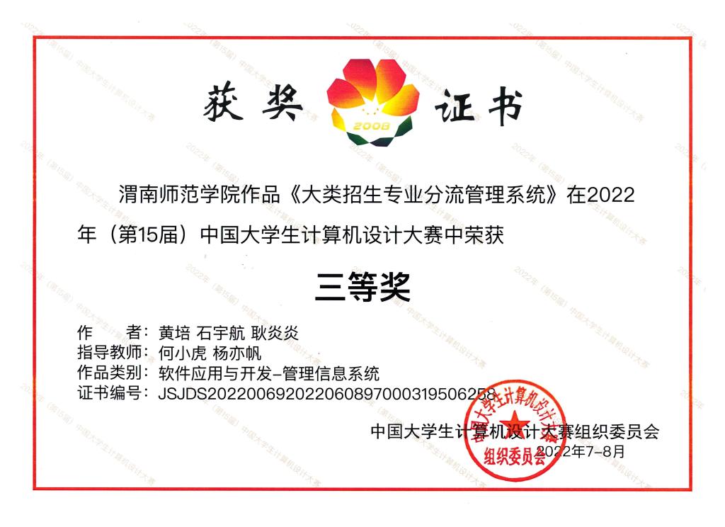 10月15日,学校获悉在2022年(第15届)年中国大学生计算机设计大赛中,我校计算机学院参赛的作品获得二等奖1项、三等奖1项的好成绩。