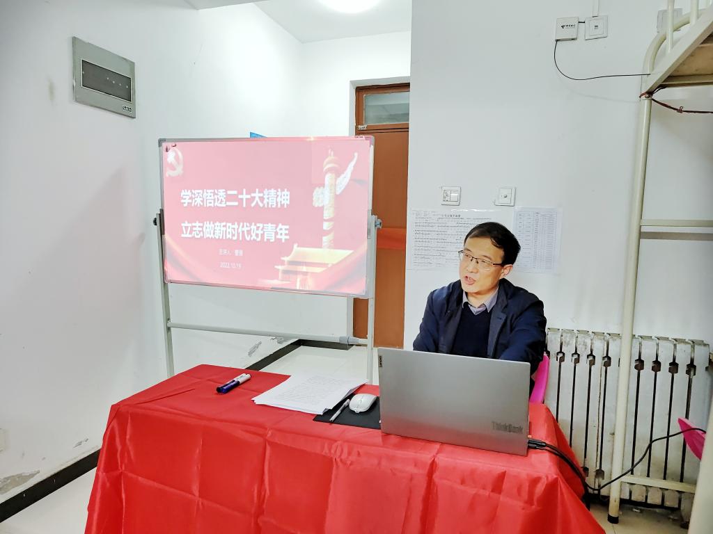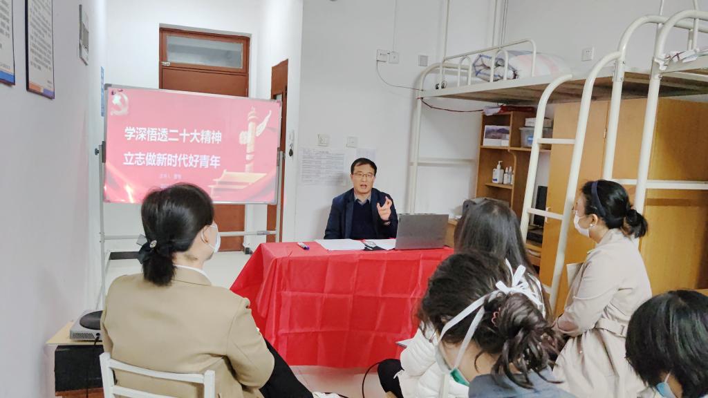 10月19日下午,副校长曹强深入人文学院包联的12号学生公寓,以“学深悟透二十大精神 立志做新时代好青年”为题讲党课。人文学院副院长张瑞芳,学工办主任白光霁,团总支书记孟子祥以及辅导员代表、学生代表参加党课学习。人文学院党总支副书记、副院长张晶主持。