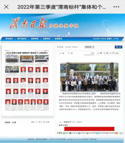 11月2日,渭南日报刊登2022年渭南市第三季度“渭南标杆”,4个集体、23名个人上榜。我校莫斯科艺术学院教职工团队荣获“渭南标杆”集体。